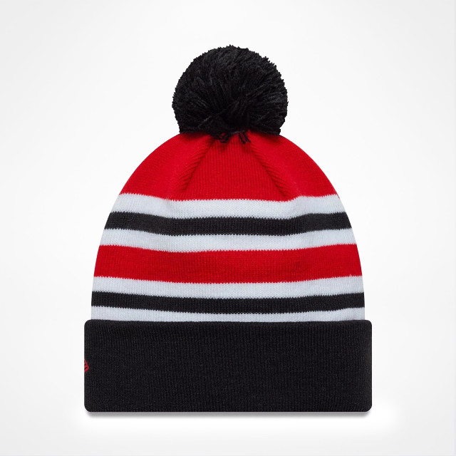 Støtt laget ditt i denne stilige Manchester United-luen med et klassisk rødt, hvitt og svart stripete design. Luen er prydet med en brodert klubblogo på det svarte oppbrettet og en dusk på toppen som gir en ekstra touch av stil.