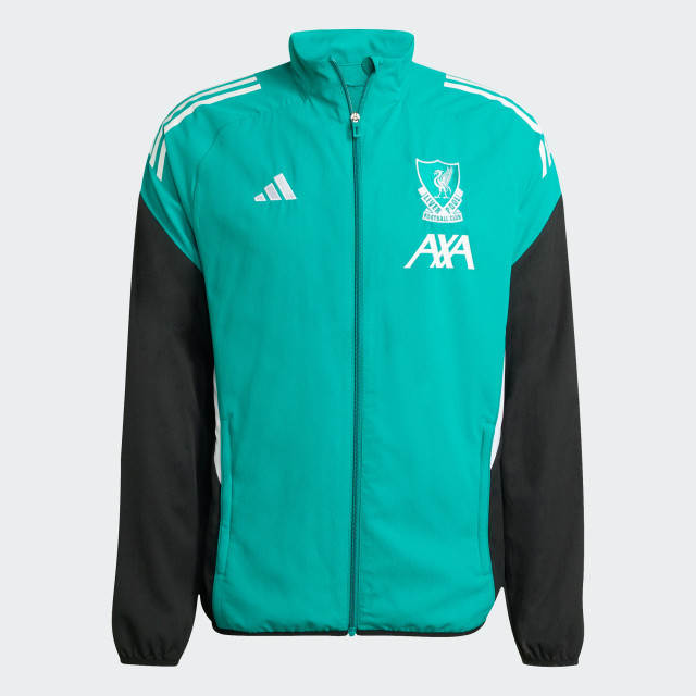 From Anfield to the streets. Get behind the Reds in this men's Liverpool FC European Presentation Jacket from adidas. In Sea Green, this jacket is cut from light, recycled fabric. It has a full-zip with a stand-up collar for coverage. Mesh lining to keep things cool. And zip pockets for storage. Finished with 3-Stripes, a Performance logo and a woven Liverpool crest.
