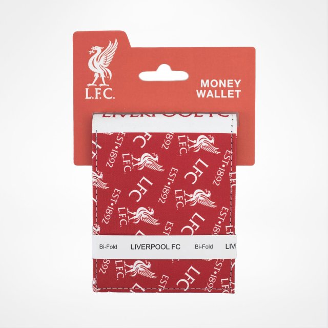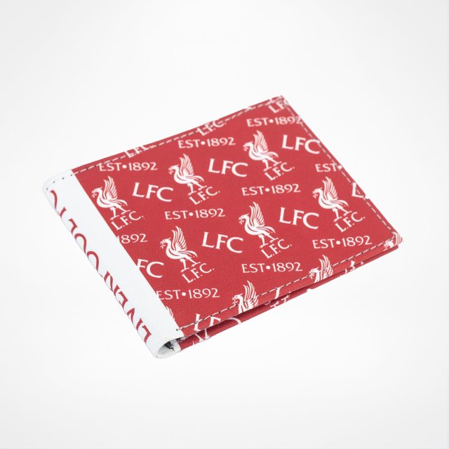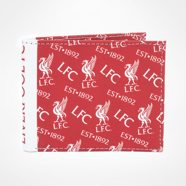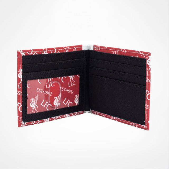 Stilig Liverpool FC-lommebok i børstet canvas med et fargerikt mønster av flere klubbikoner. Den sammenleggbare designen har ett seddelrom, fire kortlommer – inkludert ett med gjennomsiktig vindu – samt to ekstra rom. Mål: ca. 11 x 9 cm.